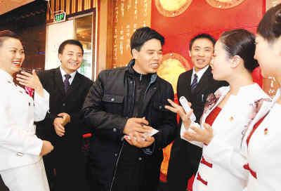 3月2日,農(nóng)民工全國人大代表、重慶城建集團(tuán)農(nóng)工班班長康厚明(中)來到北京一家重慶餐館,征求重慶籍外來工的意見。會上,他將就農(nóng)民工醫(yī)療、工傷保險(xiǎn)等問題提出相關(guān)建議。