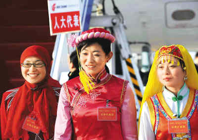 3月2日,出席十一屆全國(guó)人大一次會(huì)議的代表陸續(xù)抵達(dá)北京。 出席十一屆全國(guó)人大一次會(huì)議的甘肅代表團(tuán)抵達(dá)北京。新華社記者 王建華 攝