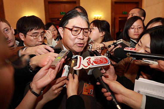 3月3日,中國人民政治協(xié)商會議第十一屆全國委員會第一次會議在北京人民大會堂開幕。這是開幕會結(jié)束后霍震霆委員接受記者采訪。