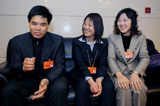 | 3月3日,三位農(nóng)民工全國人大代表康厚明(左)、胡小燕(中)和朱雪芹(右)在北京交談。新華社