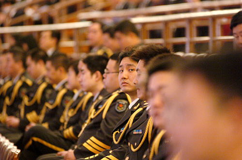 3月5日,第十一屆全國人民代表大會第一次會議在北京人民大會堂開幕。這是會議現(xiàn)場的軍樂團在演奏間歇。