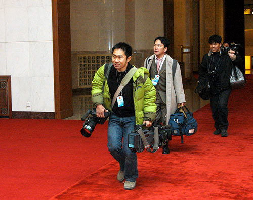 3月5日上午9時(shí),第十一屆全國人民代表大會第一次會議在人民大會堂開幕,聽取國務(wù)院總理溫家寶作政府工作報(bào)告,審查年度計(jì)劃報(bào)告和預(yù)算報(bào)告。圖為外國記者在報(bào)到。新華網(wǎng) 陳競超 攝