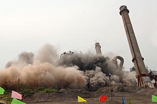 | 2007年9月5日,山東炸響拆除小火電“全國第一爆”。山東省微山湖煤電公司8臺(tái)燃煤小火電機(jī)組的主廠房和兩座煙囪被爆破拆除。新華社記者