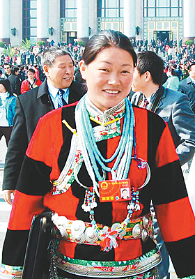 自從2003年當(dāng)選十屆全國人大代表以來,這樣的場(chǎng)面她見多了,已經(jīng)看不到當(dāng)年一說話就紅臉低頭的羞澀。 “我是沾了珞巴族的光!睍约t說,“每次到北京開會(huì),我都會(huì)提醒自己,我代表的是一個(gè)民族,我是珞巴族的唯一代表。一想到這兒,就會(huì)產(chǎn)生一種神圣感!” 珞巴族,中國人口最少的一個(gè)民族,只有3000人左右,主要分布在西藏東起察隅、西至門隅之間的珞瑜地區(qū),有自己的語言,沒有本民族文字,長期保留著刻木結(jié)繩記數(shù)記事的原始方法!扮蟀汀笔遣刈鍖(duì)他們的稱呼,意為“南方人”。 曉紅說:“過去,珞巴族屬于被壓迫的民族,長期偏居深山,新中國成立后才翻身做主,正式定名為珞巴族。從那時(shí)起,珞巴族人和西藏其他少數(shù)民族一樣,也獲得了與藏族人同等的政治、經(jīng)濟(jì)和人身自由的權(quán)利,歷屆全國人大和全國政協(xié)都為我們各保留一名代表和委員的名額! 珞巴族人只有名,沒有姓,曉紅的全名就叫曉紅。曉紅的父母都是當(dāng)?shù)冂蟀妥遛r(nóng)民。1996年,她從西藏農(nóng)牧學(xué)院畢業(yè)后,被分配到林芝地區(qū)米林縣米林鎮(zhèn)政府工作,4年后被任命為副鎮(zhèn)長,2005年7月起擔(dān)任米林縣南伊珞巴民族鄉(xiāng)鄉(xiāng)長。她務(wù)實(shí)、能干,在當(dāng)?shù)乜诒芎谩?BR> “這幾年,我利用參加全國兩會(huì)的機(jī)會(huì),直接向國家領(lǐng)導(dǎo)人反映珞巴族人的意愿,這是以前想都不敢想的事!睍约t話語里充滿了自豪。在她家,還有一位“名人”:公公達(dá)登連續(xù)當(dāng)選九屆、十屆全國政協(xié)委員。 “我能再次當(dāng)選全國人大代表,既是珞巴族人的榮耀,也說明黨和國家對(duì)少數(shù)民族的關(guān)心和重視!睍约t告訴記者,五年前她提出的有關(guān)西藏米林縣南伊珞巴民族鄉(xiāng)的公路、電、房、通信等基礎(chǔ)設(shè)施建設(shè)問題,目前已全部解決。