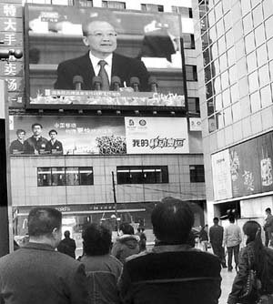 | 圖為行人在王府井步行街觀看大會(huì)直播。余倩 攝 |