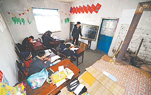 一間不足20平米的瓦房里,大通鋪上,沒(méi)有棉被,只有羊皮和狗皮做的“褥子”,這就是24個(gè)小學(xué)生的“床”;桌子上擺放著幾個(gè)鐵皮罐頭空盒,這就是學(xué)生們的“水杯”;教室里,3個(gè)年級(jí)的孩子們?cè)谝晃焕蠋煹膸ьI(lǐng)下寫著作業(yè),窗外堆滿了課余時(shí)間老師帶著學(xué)生們撿回來(lái)的牛糞,那是過(guò)冬用的取暖原料……這是青海省高原地區(qū)寄宿學(xué)校的典型寫照。