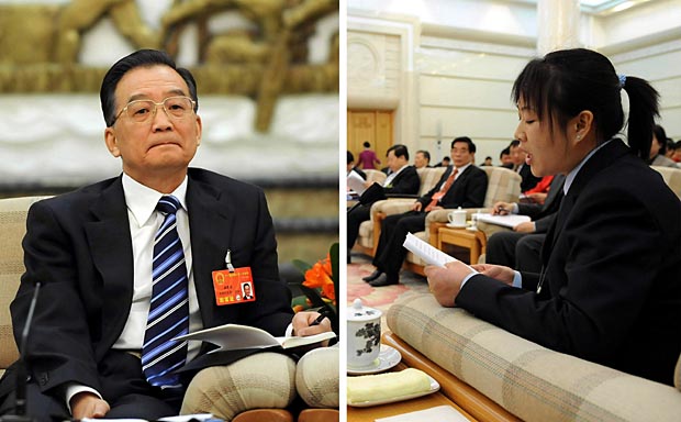 3月7日,中共中央政治局常委、國務(wù)院總理溫家寶參加十一屆全國人大一次會議廣東代表團(tuán)的審議。來自廣東佛山的農(nóng)民工代表胡小燕(右圖)發(fā)言時說:“農(nóng)民工最關(guān)心的事情就是擔(dān)心留在家鄉(xiāng)的孩子每天是不是吃飽了飯,穿暖了衣,上學(xué)的路上是不是安全……”,溫家寶總理聽胡小燕發(fā)言時表情凝重(左圖)。聽完胡小燕的發(fā)言,溫家寶總理說:“你關(guān)心的問題,也是我關(guān)心的問題!