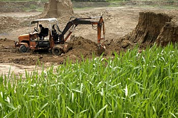 2007年5月21日,一輛鏟車在甘肅省臨夏市枹罕鎮(zhèn)的一處農(nóng)田邊取土,用于燒制國家早已明令禁止的實心磚瓦,當(dāng)?shù)?0多家磚瓦生產(chǎn)企業(yè)在基本農(nóng)田保護區(qū)范圍內(nèi)取土,造成上千畝水澆地大幅度減產(chǎn)甚至無法耕種。新華社發(fā)(資料照片) | “我國城市化、工業(yè)化的加速和目前建設(shè)用地緊缺的矛盾十分突出。2020年要達(dá)到城市化率60%、工業(yè)化率70%的目標(biāo),需要增加1.5億畝建設(shè)用地。而在18億畝耕地‘紅線’下,未來13年實際可以增加的建設(shè)用地不足3000萬畝。城市化與耕地保護之間面臨尖銳矛盾,必須妥善加以解決!”全國政協(xié)委員、清華大學(xué)人文學(xué)院經(jīng)濟研究所副所長蔡繼明接受記者采訪時對城市化與耕地保護這對矛盾表達(dá)了自己的憂慮。 和蔡繼明委員的關(guān)注相同,記者采訪發(fā)現(xiàn),在本次兩會上,如何妥善保護耕地這一話題在代表委員們中間引發(fā)了熱議,他們建議盡快促進農(nóng)村集體建設(shè)用地流轉(zhuǎn),同時,呼吁地方政府摒棄“賣地財政”行為。