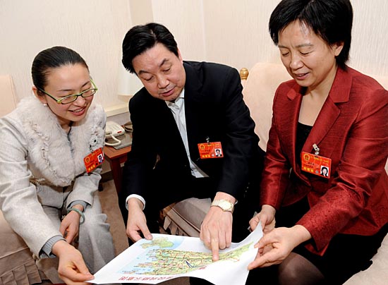 | 圖為來自河南的趙素萍代表(右)、來自甘肅的張津梁代表(中)和畢紅珍代表(左)在一起討論建議規(guī)劃建設(shè)線路示意圖。 |