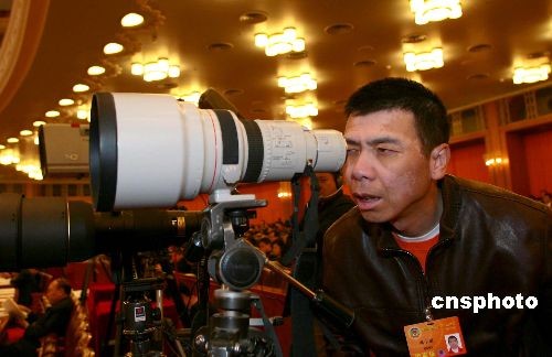 全國政協(xié)十一屆一次會議第二次全體會議在北京人民大會堂舉行。著名導(dǎo)演、北京電視藝術(shù)中心的馮小剛委員在大會堂借用攝影記者的長焦鏡頭細(xì)觀會場。