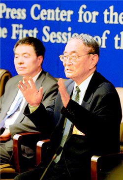 | 圖為昨天(3月10日),全國政協委員厲以寧就“民主黨派幫助畢節(jié)地區(qū)脫貧致富”主題接受記者集體采訪。吳鏑/攝 | “后奧運”中國經濟不會滑坡