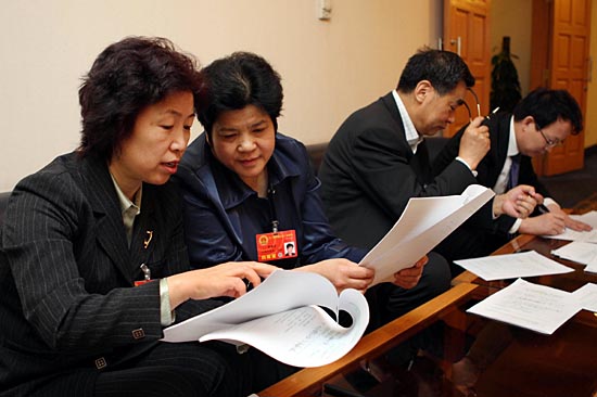 3月11日,來自山西省的全國人大代表郭新志(左二)向全國人大代表、山西省監(jiān)察廳副廳長劉蓉華(左一)介紹她將向大會(huì)提交的有關(guān)改善基層勞動(dòng)模范待遇以及保障殘疾兒童生活的建議,請劉蓉華復(fù)議。