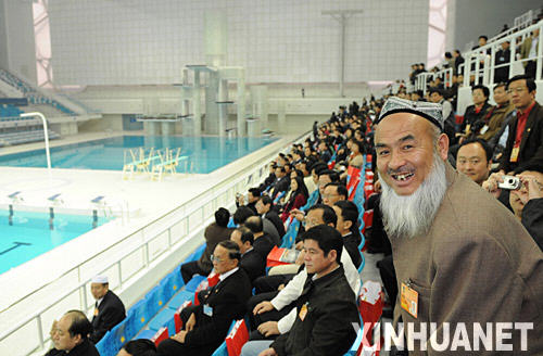 3月12日,出席全國政協(xié)十一屆一次會(huì)議的部分全國政協(xié)委員參觀北京奧運(yùn)場館。這是白克力·馬木提委員(前右,維吾爾族)在國家游泳館內(nèi)參觀。