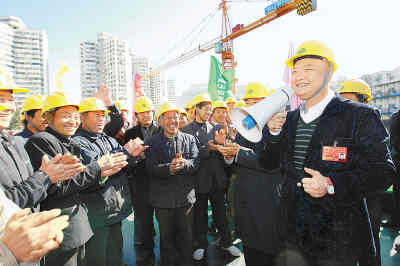 3月13日,十一屆全國人大一次會議代表休息日。上午9點多,來自河南的全國人大代表、相聲演員范軍來到位于北京市北三環(huán)的一處工地,看望在這里打工的河南籍民工,了解他們的生活、工作情況,并收集創(chuàng)作素材。趁著工友們午休時候,范軍代表還即興表演了幾個相聲段子,把大伙逗得開懷大笑。