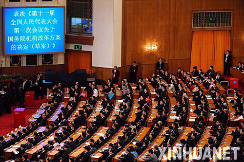 “贊成2744票……” 人民大會(huì)堂大禮堂,主席臺(tái)兩側(cè)的藍(lán)色電子屏幕上,清晰地顯示出由一組數(shù)字組成的表決結(jié)果。 時(shí)間定格在2008年3月15日上午9時(shí)06分。十一屆全國(guó)人大一次會(huì)議第五次全體會(huì)議正在舉行。 “通過(guò)!” 隨著主持會(huì)議的大會(huì)執(zhí)行主席、主席團(tuán)常務(wù)主席王兆國(guó)一聲宣布,最高國(guó)家權(quán)力機(jī)關(guān)高票通過(guò)關(guān)于國(guó)務(wù)院機(jī)構(gòu)改革方案的決定,批準(zhǔn)了新時(shí)期以來(lái)的第6次國(guó)務(wù)院機(jī)構(gòu)改革方案。 熱烈的掌聲在大禮堂響起…… 這是對(duì)改革方案的肯定,更寄托著對(duì)加快行政管理體制改革、建設(shè)服務(wù)型政府的殷切期盼。 從1982年到2003年,改革開(kāi)放以來(lái)5輪大規(guī)模的機(jī)構(gòu)改革,勾勒了行政管理體制改革推進(jìn)的軌跡。 張少軍代表感慨地說(shuō):“每一次改革,都是一次深化。雖然我國(guó)現(xiàn)行行政管理體制基本適應(yīng)經(jīng)濟(jì)社會(huì)發(fā)展的要求,但政府機(jī)構(gòu)和政府職能仍然存在諸多與新形勢(shì)新任務(wù)不相適應(yīng)的方面,特別是與深入貫徹落實(shí)科學(xué)發(fā)展觀(guān)、構(gòu)建社會(huì)主義和諧社會(huì)等重大戰(zhàn)略思想的要求還存在較大差距! “加快行政管理體制改革,建設(shè)服務(wù)型政府”——黨的十七大明確提出深化行政管理體制改革的總要求。 “到2020年建立起比較完善的中國(guó)特色社會(huì)主義行政管理體制”——黨的十七屆二中全會(huì)描繪了深化行政管理體制改革的總目標(biāo)。 逐字研讀,熱烈探討,坦誠(chéng)直言……大會(huì)期間,代表們對(duì)國(guó)務(wù)院機(jī)構(gòu)改革方案進(jìn)行了認(rèn)真審議。 加強(qiáng)和改善宏觀(guān)調(diào)控,促進(jìn)科學(xué)發(fā)展;著眼于保障和改善民生,加強(qiáng)社會(huì)管理和公共服務(wù);按照探索職能有機(jī)統(tǒng)一的大部門(mén)體制要求,對(duì)一些職能相近的部門(mén)進(jìn)行整合——此次改革突出的三個(gè)重點(diǎn),獲得代表們的普遍認(rèn)可。 “這些重點(diǎn),抓住了當(dāng)前深化行政管理體制改革的關(guān)鍵,體現(xiàn)了科學(xué)發(fā)展觀(guān)的要求!标惷鼬Q代表說(shuō)。 對(duì)新一輪國(guó)務(wù)院機(jī)構(gòu)改革,代表們充滿(mǎn)期待—— “今年是全面貫徹落實(shí)黨的十七大戰(zhàn)略部署的第一年。要按照大會(huì)通過(guò)的方案,積極穩(wěn)妥地推進(jìn)國(guó)務(wù)院機(jī)構(gòu)改革,確保行政管理體制改革順利進(jìn)行。”林武代表表示。 “要按照決策權(quán)、執(zhí)行權(quán)、監(jiān)督權(quán)既相互制約又相互協(xié)調(diào)的要求,著力優(yōu)化組織結(jié)構(gòu),規(guī)范機(jī)構(gòu)設(shè)置,完善運(yùn)行機(jī)制,為全面建設(shè)小康社會(huì)提供組織保障。”甘道明代表認(rèn)為。 新一輪國(guó)務(wù)院機(jī)構(gòu)改革大幕已啟!凹訌(qiáng)領(lǐng)導(dǎo),周密部署,保證機(jī)構(gòu)改革方案的順利實(shí)施”——大會(huì)決定中的這段話(huà),道出了億萬(wàn)人民共同的心聲!