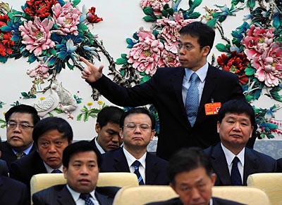 全國人大代表、河北秦皇島市代市長朱浩文(后立者)說,秦皇島市是沿海旅游城市,應(yīng)借助奧運(yùn)會帶來的機(jī)會,做大做強(qiáng)旅游業(yè)等傳統(tǒng)優(yōu)勢產(chǎn)業(yè),加速產(chǎn)業(yè)換代升級,落實(shí)“綠色奧運(yùn)、科技奧運(yùn)、人文奧運(yùn)”的理念,發(fā)展“高科技、低能耗、無污染”產(chǎn)業(yè),促進(jìn)經(jīng)濟(jì)由粗放擴(kuò)張型向精細(xì)集約型轉(zhuǎn)變。