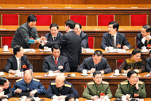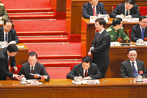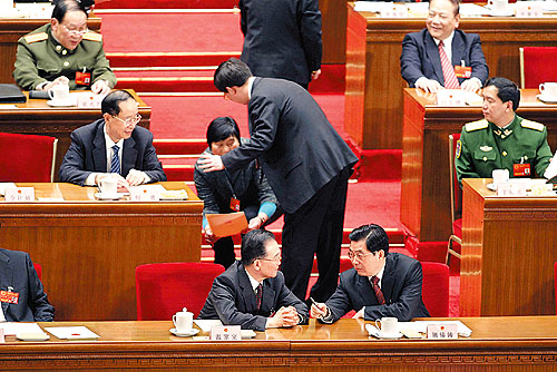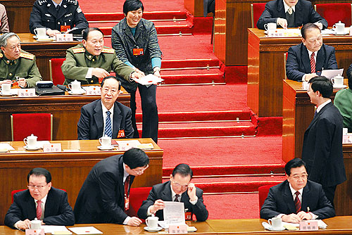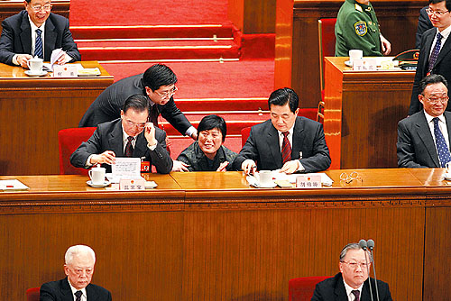 ①3月17日15時36分,監(jiān)票人員正在統(tǒng)計(jì)選票,大會稍事休息。一位女代表想請胡錦濤主席簽名,被一位工作人員勸阻。這位女代表叫謝木蘭,是江西省余干縣瑞洪鎮(zhèn)鎮(zhèn)郊村婦女主任?吹胶\濤和溫家寶正在交談,謝木蘭仍不想放棄這次機(jī)會。