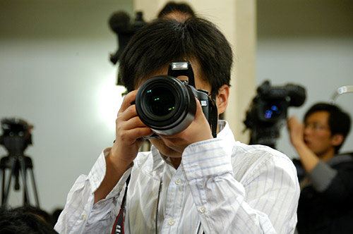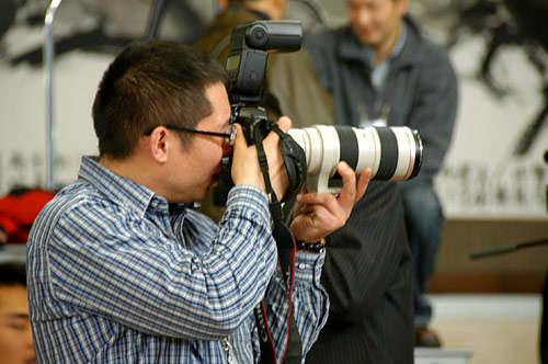 3月18日上午十一屆全國人大一次會議閉幕后,國務院總理溫家寶在人民大會堂三樓中央大廳與采訪十一屆全國人大一次會議的中外記者見面并回答記者提出的問題。圖為記者在調(diào)試設備。