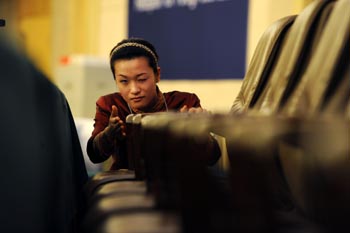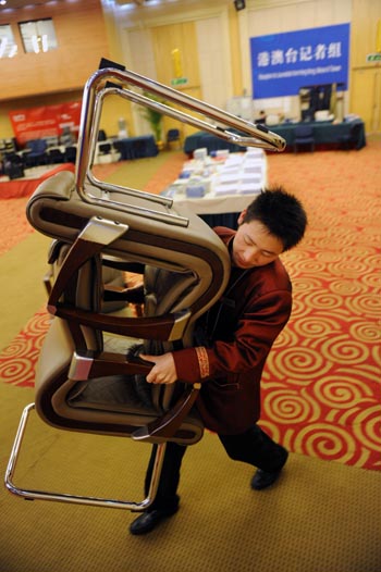 3月10日,新聞中心工作人員劉艷明和同事一起擺放座椅,要求各點(diǎn)整齊一線。