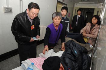 這是3月9日,全國政協(xié)委員卞志良(左一)在北京朝陽醫(yī)院看望一位等候就醫(yī)的患者。卞志良利用休會的半天時間,專程前往北京朝陽醫(yī)院,就醫(yī)療改革進(jìn)行走訪調(diào)研。他著重對藥品價格,看病難、用藥貴等問題征詢了醫(yī)患雙方的意見,希望以此進(jìn)一步完善有關(guān)城鄉(xiāng)醫(yī)療改革的提案。