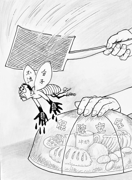 據(jù)《新華每日電訊》報道,西寧市一外來務(wù)工人員用含有致癌物的皮革防腐劑、工業(yè)鹽加工了53噸腌菜陸續(xù)出售,已被刑事拘留。近年來食品安全事件時有發(fā)生,食品安全問題已令廣大消費(fèi)者心生疑慮。目前我國食品安全法草案正在廣泛征求社會意見,由此建議:應(yīng)對制造食品安全事件的相關(guān)責(zé)任人要格外嚴(yán)厲處罰,讓違法者賠得傾家蕩產(chǎn),才能起到“殺一儆百”的警示威懾作用!懊褚允碁樘臁,讓不安全的食品遠(yuǎn)離百姓生活。