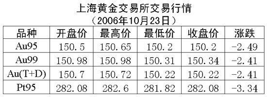 23日,上海黃金交易所黃金Au99.95收盤于150.20元/克,下跌2.49元/克,共成交1640公斤;黃金Au99.99收盤于150.34元/克,下跌2.41元/克,共成交445.40公斤;鉑金Pt99.95收盤于282.08元/克,下跌3.34元/克,共成交152公斤;黃金Au(T+D)延期交易品種收盤于150.22元/克,下跌2.41元/克,共成交1560公斤。