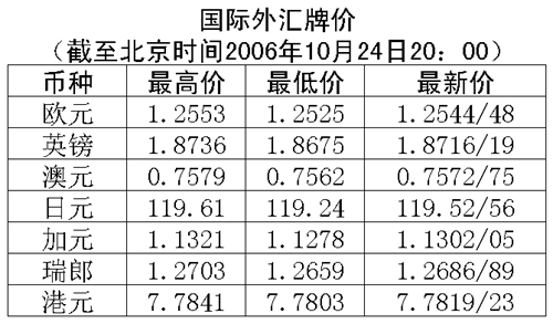 根據(jù)中國人民銀行授權(quán)中國外匯交易中心發(fā)布的公告,2006年10月24日銀行間外匯市場美元等交易貨幣對人民幣匯率的中間價為:1美元兌人民幣7.9049元,1歐元兌人民幣9.9171元,100日元兌人民幣6.6244元,1港元兌人民幣1.01573元,1英鎊兌人民幣14.8032元。