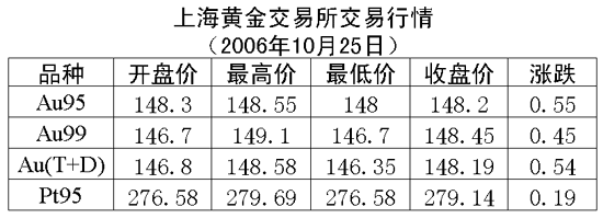 25日,上海黃金交易所黃金各個交易品種全線上漲,Au99.95收盤于148.20元/克,上漲0.55元/克,共成交1388公斤;黃金Au99.99收盤于148.45元/克,上漲0.45元/克,共成交325.40公斤;鉑金Pt99.95收盤于279.14元/克,上漲0.19元/克,共成交84公斤;黃金Au(T+D)延期交易品種收盤于148.19元/克,上漲0.54元/克,共成交2278公斤。