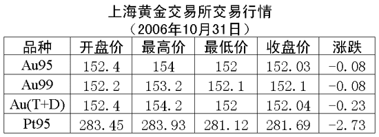 31日,上海黃金交易所各個交易品種全線下跌。黃金Au99.95收盤于152.03元/克,下跌0.08元/克,共成交2394公斤;黃金Au99.99收盤于152.10元/克,下跌0.08元/克,共成交809公斤;鉑金Pt99.95收盤于281.69元/克,下跌2.73元/克,共成交132公斤;黃金Au(T+D)延期交易品種收盤于152.04元/克,下跌0.23元/克,共成交4144公斤。上海黃金交易所白銀Ag(T+D)延期交易品種收盤于3373.00元/公斤,下跌1.00元/公斤,共成交28公斤;現(xiàn)貨白銀Ag99.9沒有成交。