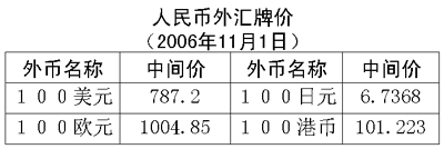 中國人民銀行授權(quán)中國外匯交易中心公布,2006年11月1日銀行間外匯市場(chǎng)美元等交易貨幣對(duì)人民幣匯率的中間價(jià)為:1美元對(duì)人民幣7.8720元,1歐元對(duì)人民幣10.0485元,100日元對(duì)人民幣6.7368元,1港元對(duì)人民幣1.01223元,1英鎊對(duì)人民幣15.0200元。