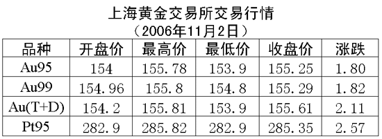 2日,上海黃金交易所各個(gè)交易品種全線上漲,黃金Au99.95收盤于155.25元/克,上漲1.80元/克,共成交3262公斤;黃金Au99.99收盤于155.29元/克,上漲1.82元/克,共成交1108.40公斤;鉑金Pt99.95收盤于285.35元/克,上漲2.57元/克,共成交80公斤;黃金Au(T+D)延期交易品種收盤于155.61元/克,上漲2.11元/克,共成交5684公斤。