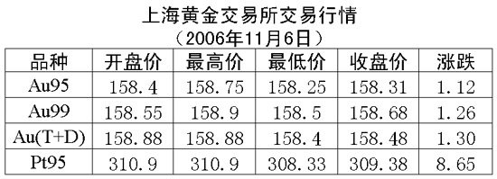 6日,上海黃金交易所各個(gè)交易品種全線上漲,黃金Au99.95收盤(pán)于158.31元/克,上漲1.12元/克,共成交3898公斤;黃金Au99.99收盤(pán)于158.68元/克,上漲1.26元/克,共成交1665.60公斤;鉑金Pt99.95收盤(pán)于309.38元/克,上漲8.65元/克,共成交46公斤;黃金Au(T+D)延期交易品種收盤(pán)于158.48元/克,上漲1.30元/克,共成交4916公斤。