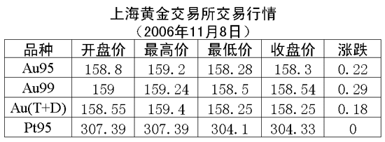 8日,上海黃金交易所黃金Au99.95收盤于158.30元/克,上漲0.22元/克,共成交1560公斤;黃金Au99.99收盤于158.54元/克,上漲0.29元/克,共成交452.20公斤;鉑金Pt99.95收盤于304.33元/克,與7日價格持平,共成交76公斤;黃金Au(T+D)延期交易品種收盤于158.25元/克,上漲0.18元/克,共成交2720公斤。