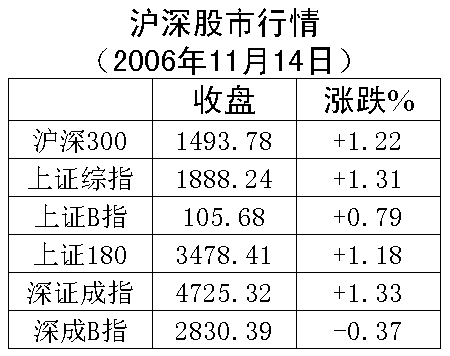 11月14日,經(jīng)過此前多空雙方的激烈爭(zhēng)奪,深滬大盤終于止跌回升,基本扭轉(zhuǎn)了短期市場(chǎng)的頹勢(shì)。早盤開盤后股指先是短暫回探,但很快就被工商銀行等銀行類個(gè)股拉起,摸高1887點(diǎn)后,又在鋼鐵板塊大幅調(diào)整的拖累下持續(xù)回落,最低觸及1841點(diǎn)。至尾市,在通信板塊及食品板塊的合力推動(dòng)下再度展開反抽,最終兩市強(qiáng)勢(shì)收出紅盤,并以接近全天高位報(bào)收。