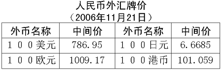 根據(jù)中國(guó)人民銀行授權(quán)中國(guó)外匯交易中心發(fā)布的公告,2006年11月21日銀行間外匯市場(chǎng)美元等交易貨幣對(duì)人民幣匯率的中間價(jià)為:1美元兌人民幣7.8695元,1歐元兌人民幣10.0917元,100日元兌人民幣6.6685元,1港幣兌人民幣1.01059元,1英鎊兌人民幣14.9383元。