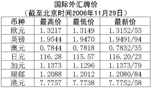 根據(jù)中國(guó)人民銀行授權(quán)中國(guó)外匯交易中心發(fā)布的公告,2006年11月29日銀行間外匯市場(chǎng)美元等交易貨幣對(duì)人民幣匯率的中間價(jià)為:1美元兌人民幣7.8394元,1歐元兌人民幣10.3490元,100日元兌人民幣6.7704元,1港幣兌人民幣1.00823元,1英鎊兌人民幣15.3113元。