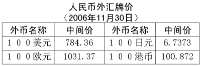 根據(jù)中國(guó)人民銀行授權(quán)中國(guó)外匯交易中心發(fā)布的公告,2006年11月30日銀行間外匯市場(chǎng)美元等交易貨幣對(duì)人民幣匯率的中間價(jià)為:1美元兌人民幣7.8436元,1歐元兌人民幣10.3137元,100日元兌人民幣6.7373元,1港幣兌人民幣1.00872元,1英鎊兌人民幣15.2629元。