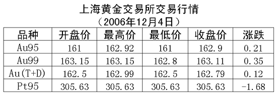 4日,上海黃金交易所黃金Au99.95收盤于162.90元/克,上漲0.21元/克,共成交2408公斤;黃金Au99.99收盤于163.11元/克,上漲0.35元/克,共成交800公斤;鉑金Pt99.95收盤于305.63元/克,下跌1.68元/克,共成交46公斤。黃金Au(T+D)延期交易品種收盤于162.79元/克,下跌0.12元/克,共成交1318公斤。