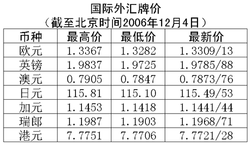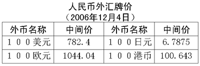 根據(jù)中國(guó)人民銀行授權(quán)中國(guó)外匯交易中心發(fā)布的公告,2006年12月4日銀行間外匯市場(chǎng)美元等交易貨幣對(duì)人民幣匯率的中間價(jià)為:1美元兌人民幣7.8240元,1歐元兌人民幣10.4404元,100日元兌人民幣6.7875元,1港幣兌人民幣1.00643元,1英鎊兌人民幣15.4992元。