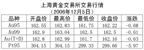 與國(guó)際市場(chǎng)相反當(dāng)日國(guó)內(nèi)金價(jià)在震蕩中下行。上海黃金交易所黃金Au99.95收盤于162.22元/克,下跌0.68元/克,共成交1832公斤;黃金Au99.99收盤于162.50元/克,下跌0.61元/克,共成交368公斤;鉑金Pt99.95收盤于299.66元/克,下跌5.97元/克,共成交282公斤。黃金Au(T+D)延期交易品種收盤于162.16元/克,下跌0.63元/克,共成交3622公斤。