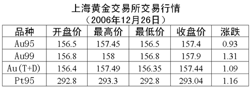 26日,上海黃金交易所黃金Au99.95收盤于157.40元/克,上漲0.93元/克,共成交2370公斤;黃金Au99.99收盤于157.90元/克,上漲1.31元/克,共成交456.40公斤;鉑金Pt99.95收盤于293.04元/克,上漲1.16元/克,共成交60公斤。黃金Au(T+D)延期交易品種收盤于157.44元/克,上漲1.09元/克,共成交1462公斤。