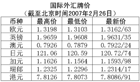 根據(jù)中國人民銀行授權中國外匯交易中心發(fā)布的公告,2007年2月26日銀行間外匯市場美元等交易貨幣對人民幣匯率的中間價為:1美元兌人民幣7.7498元,1歐元兌人民幣10.2213元,100日元兌人民幣6.4096元,1港幣兌人民幣0.99253元,1英鎊兌人民幣15.2255元。美元對人民幣匯率中間價高于春節(jié)前最后一個交易日即16日的中間價7.7408元。