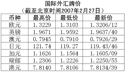 根據(jù)中國人民銀行授權(quán)中國外匯交易中心發(fā)布的公告,2007年2月27日銀行間外匯市場美元等交易貨幣對人民幣匯率的中間價為:1美元兌人民幣7.7471元,1歐元兌人民幣10.2110元,100日元兌人民幣6.4270元,1港幣兌人民幣0.99170元,1英鎊兌人民幣15.2053元。