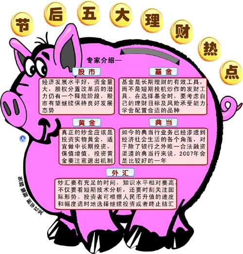 辭舊迎新的時節(jié),基金公司忙著分紅,保險公司急著推出新產(chǎn)品,銀行的人民幣理財產(chǎn)品更是拉開陣勢搞促銷。剛剛享受過2006年紅紅火火的理財經(jīng)歷,使得人們在走親訪友、恭賀農(nóng)歷新年之余,也大都開始悄悄地為自己謀劃新年的“發(fā)財計劃”。