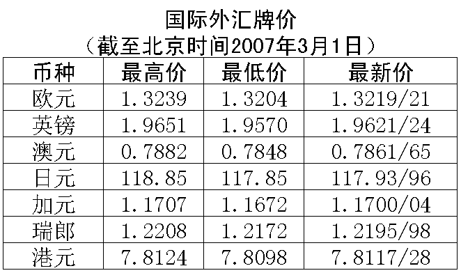 根據(jù)中國人民銀行授權(quán)中國外匯交易中心發(fā)布的公告,2007年3月1日銀行間外匯市場美元等交易貨幣對人民幣匯率的中間價(jià)為:1美元兌人民幣7.7472元,1歐元兌人民幣10.2544元,100日元兌人民幣6.5289元,1港幣兌人民幣0.99174元,1英鎊兌人民幣15.2174元。