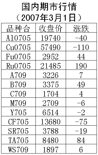 3月1日(周四),國(guó)內(nèi)期貨市場(chǎng)金屬下跌,能源類上漲。倫敦銅周三下跌25美元/噸,收盤6050美元/噸。滬銅704合約周四下跌200元/噸,收盤57540元/噸。倫敦鋁周三下跌17.5美元/噸,收盤2827美元/噸。滬鋁705合約周四下跌40元/噸,收盤19740元/噸。