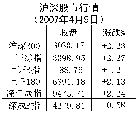 承接前一交易周的上揚勢頭,滬深股市9日強勢拉升,雙雙實現(xiàn)“六連陽”。上證綜指向3400點整數(shù)關(guān)口發(fā)起沖擊雖功虧一簣,但仍和深證成指一起以3399.51點和9509.60點創(chuàng)下了歷史新高。