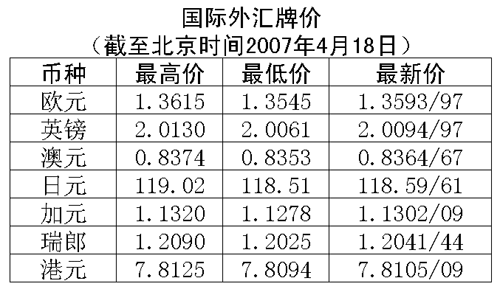 根據(jù)中國人民銀行授權(quán)中國外匯交易中心發(fā)布的公告,2007年4月18日銀行間外匯市場美元等交易貨幣對人民幣匯率的中間價為:1美元兌人民幣7.7238元,1歐元兌人民幣10.4916元,100日元兌人民幣6.5048元,1港幣兌人民幣0.98887元,1英鎊兌人民幣15.5105元。
