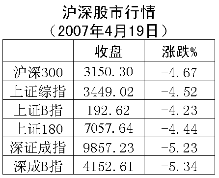 承接周三的下調(diào),滬深股市大盤19日低開后出現(xiàn)近一個(gè)月來少見的大規(guī)模深幅下跌:上證綜指和深證成指分別下跌163點(diǎn)和544點(diǎn),收?qǐng)?bào)于3449.02點(diǎn)和9857.23,跌幅為4.52%、5.23%。