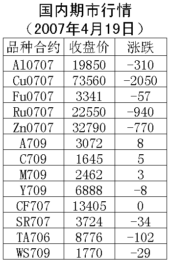 4月19日國(guó)內(nèi)期貨市場(chǎng)除豆類產(chǎn)品其余品種全線下跌。倫敦銅周三下跌130美元/噸,收盤7955美元/噸。滬銅707合約周四下跌2050元/噸,收盤73560元/噸。倫敦鋁周三下跌10美元/噸,收盤2874。5美元/噸。滬鋁707合約周三下跌310遠(yuǎn)/噸,收盤19850元/噸。